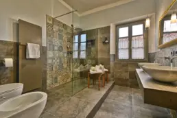 Das elegante Ambiente des alten Herrenhauses mit seinen Deckenfresken lässt jeden in eine Atmosphäre vergangener Zeiten eintauchen, die durch allen modernen Komfort bereichert wird. Die sorgfältige Renovierung ermöglicht die gelungene Verbindung alter Elemente mit modernsten Lösungen, um den Aufenthalt komfortabel und einzigartig zu gestalten.