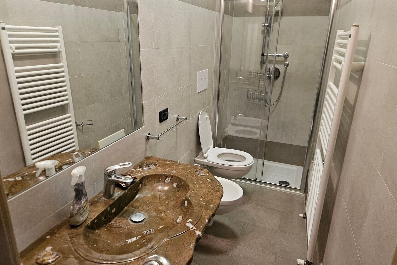 Ein großes Schlafzimmer mit Doppelbett (und direktem Zugang zum Balkon) mit einem angrenzenden, behindertengerechten Badezimmer, ein für Smart Working ausgestattetes Arbeitszimmer und ein zweites Badezimmer vervollständigen die Räumlichkeiten im Erdgeschoss.